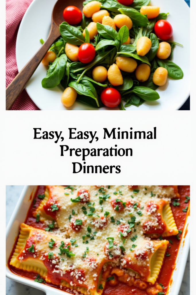 • Dump and Bake Veggie Lasagna: Alternate layers of no-boil noodles, ricotta, spinach, marinara, and mozzarella in a casserole dish, then let the oven work its magic. Easy, filling, and perfect for leftovers.