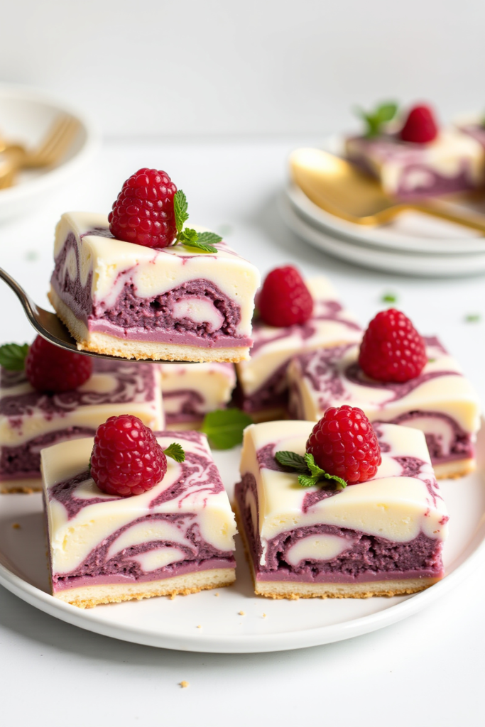 Fresh raspberries are pureed, sweetened, and optionally sieved for a seedless finish. The puree is rippled through the filling for dramatic color and flavor. For an extra burst of taste, reserve some puree as a vibrant topping, finished with a few whole raspberries for that bakery-worthy look.