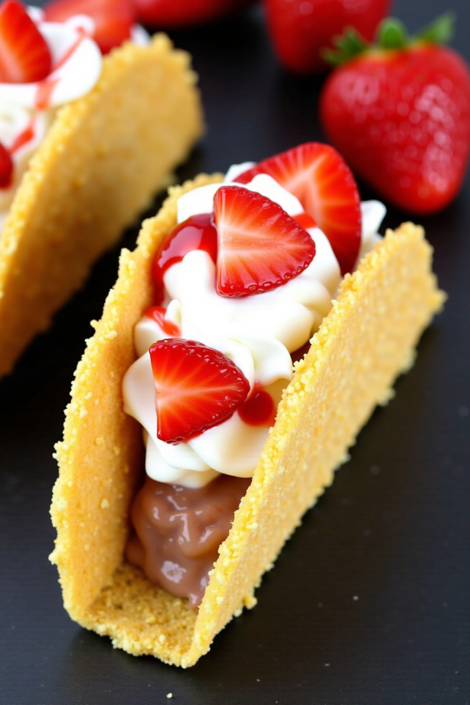 Gently fill each taco shell with the whipped cheesecake mixture using a piping bag or spoon for a neat presentation. Sprinkle the strawberry crunch generously over the top, and finish with a few fresh strawberry slices or a drizzle of white chocolate for an extra layer of decadence. Chill the tacos before serving so the filling sets, giving you a picture-perfect—and mess-free—dessert.